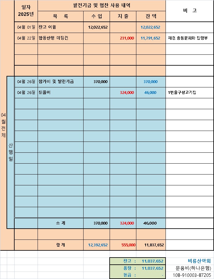 203차 비룡산악회 정기산행 수락산 시산제 정산 내역
